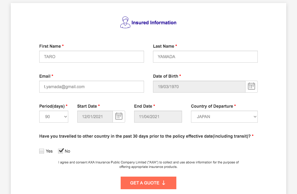 例)Insurance Certificate - Mr. Taro Yamada - 保険証明書はプリントアウトして必ず一部は保管しておくこと。空港にて提示が必要。