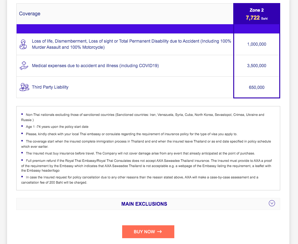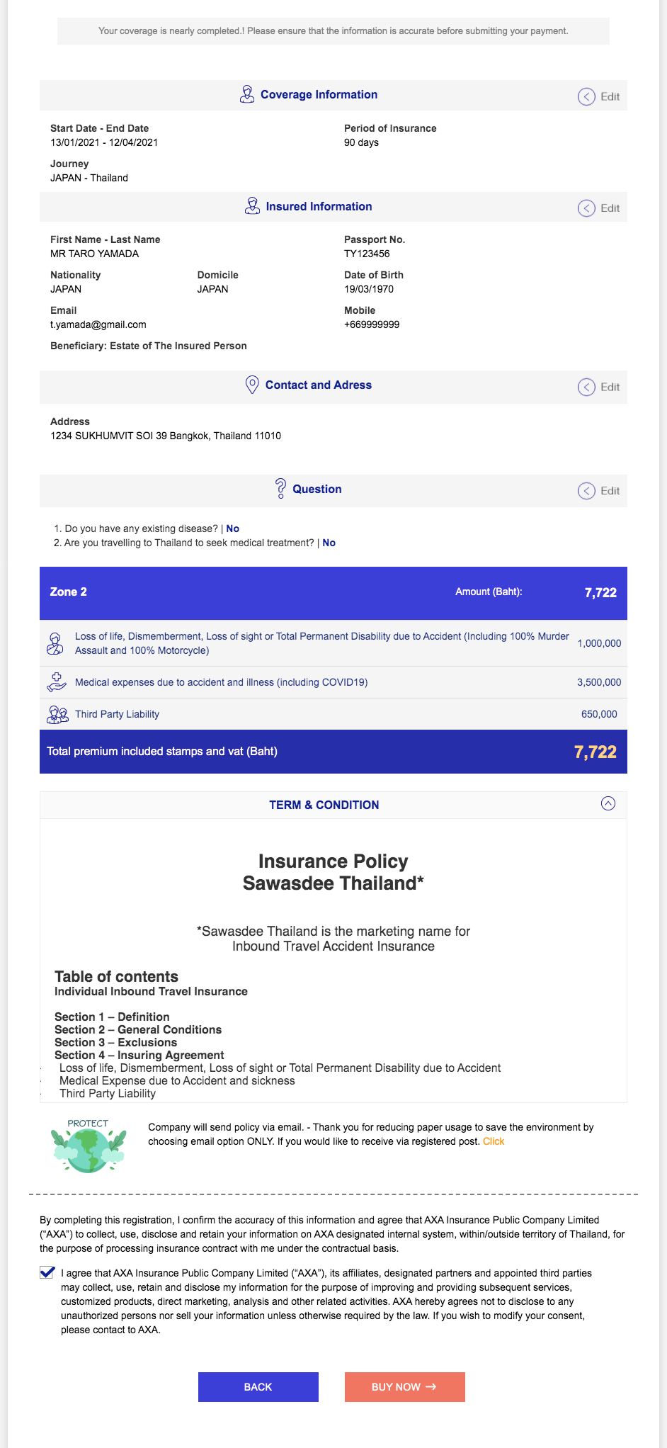 既にタイ国内でコロナウイルス感染症に特化した保険が販売されており、ウェブ上で申し込みをし、クレジットカードで決済すると即時に英文医療保険の証明書が発行されます。