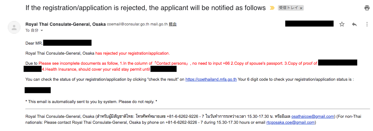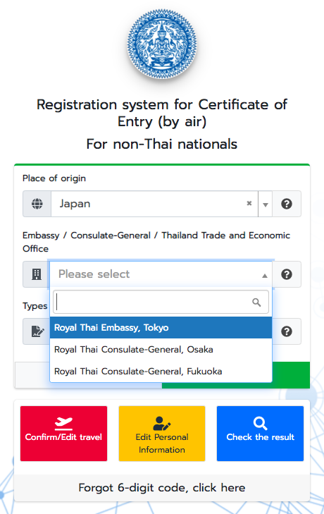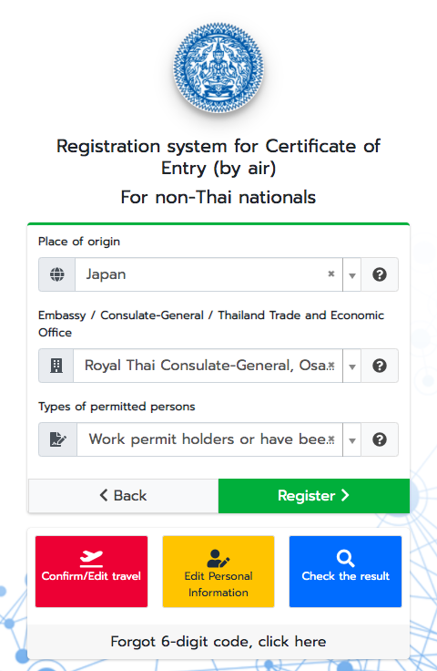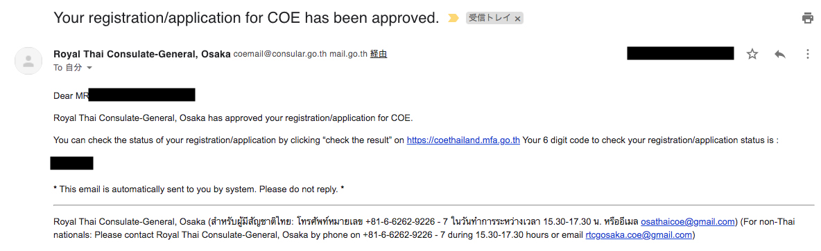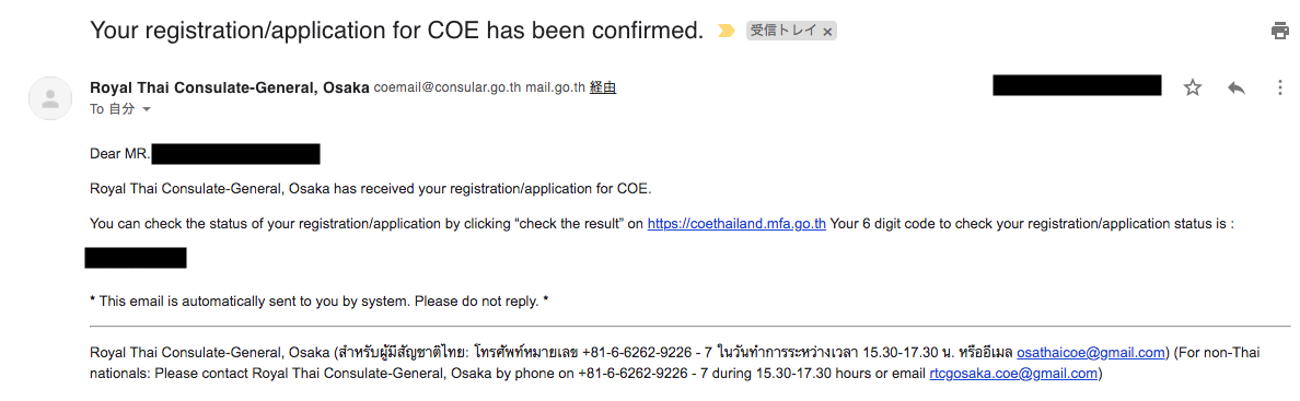 この時点で上記の情報とデータファイルがタイ大使館、又は領事館に送信されると同時に、6桁のコードが発行されます。