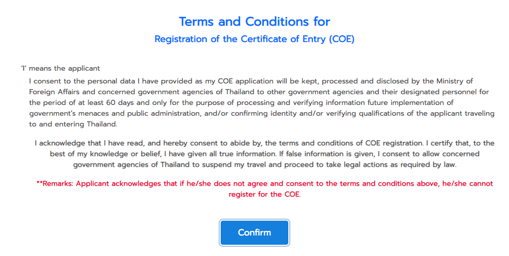 https://coethailand.mfa.go.th/(入国許可証(COE)申請ページ)にアクセスし、前述した手順で下記の登録画面まできましたら