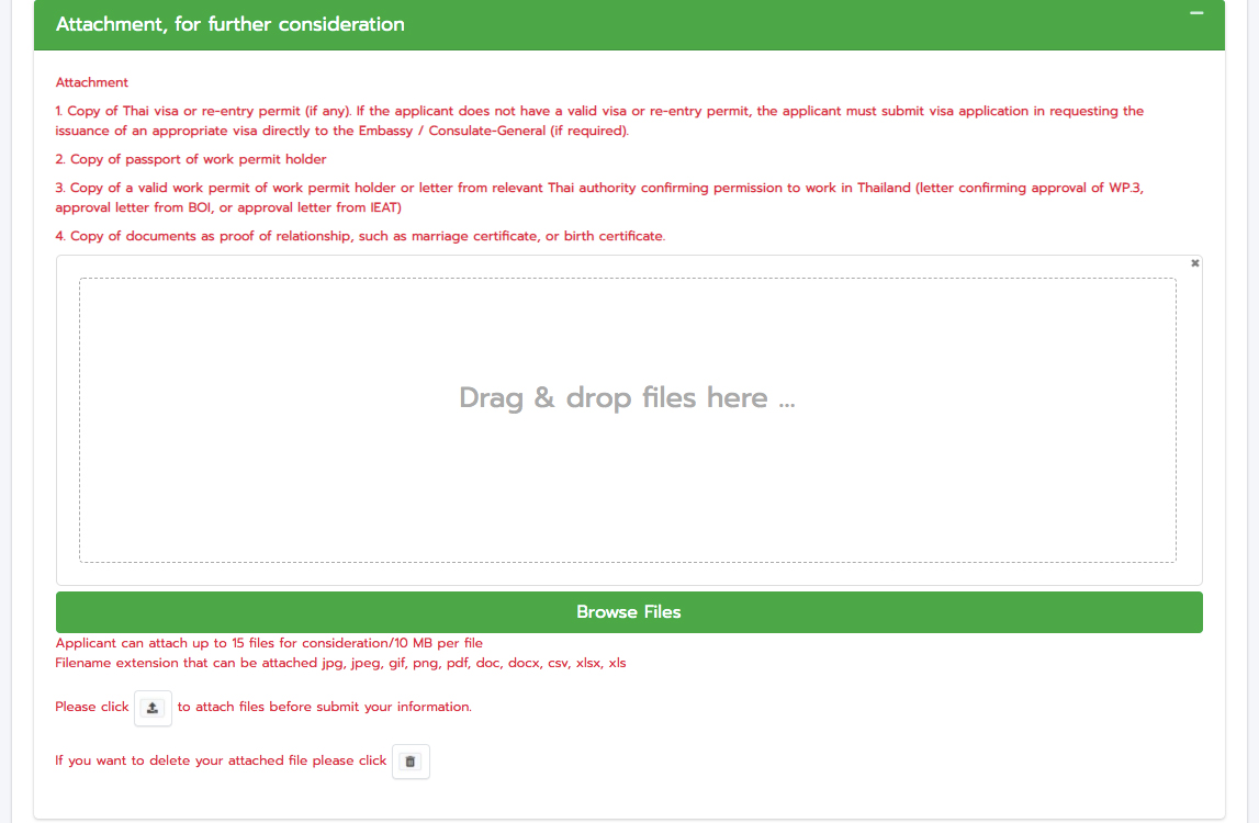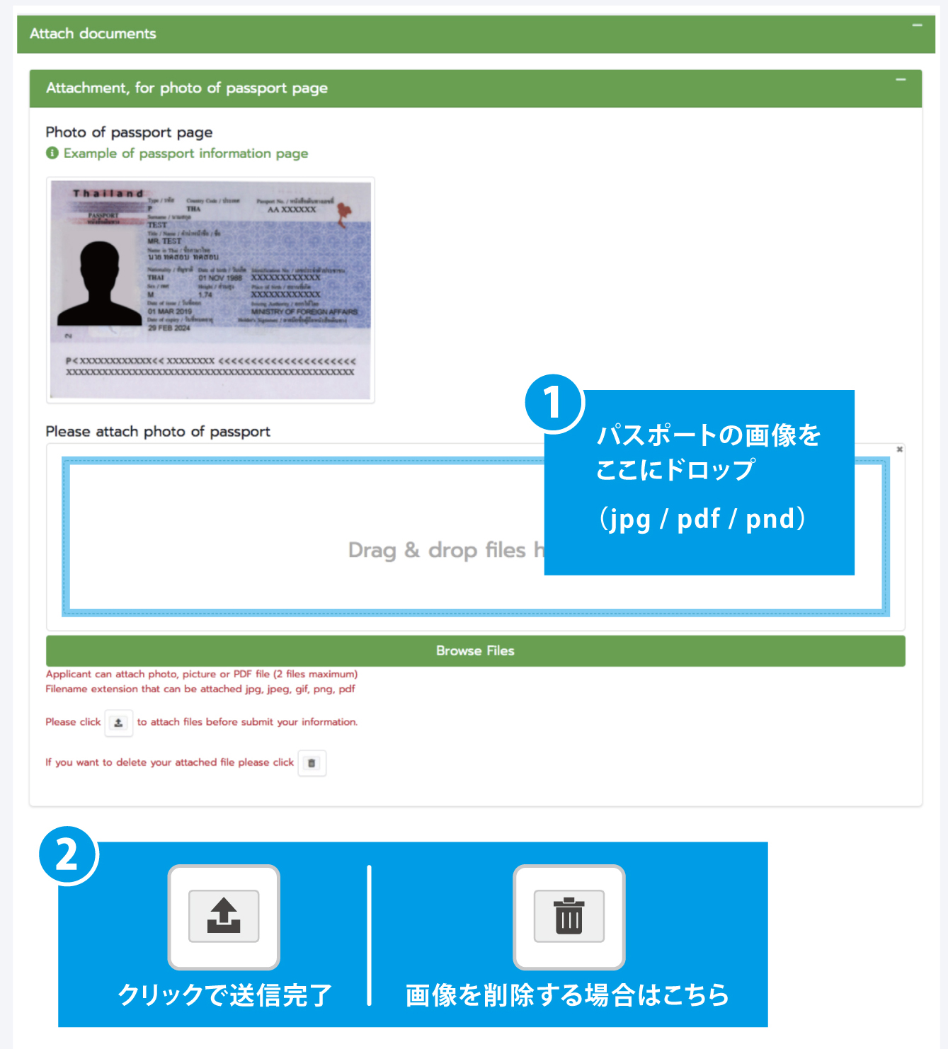 「Browse Files」をクリック(もしくはドラッグ・ドロップ)して、セーブしておいた、ビザスタンプのページ、再入国許可、ワークパーミットのデータファイルを選択する