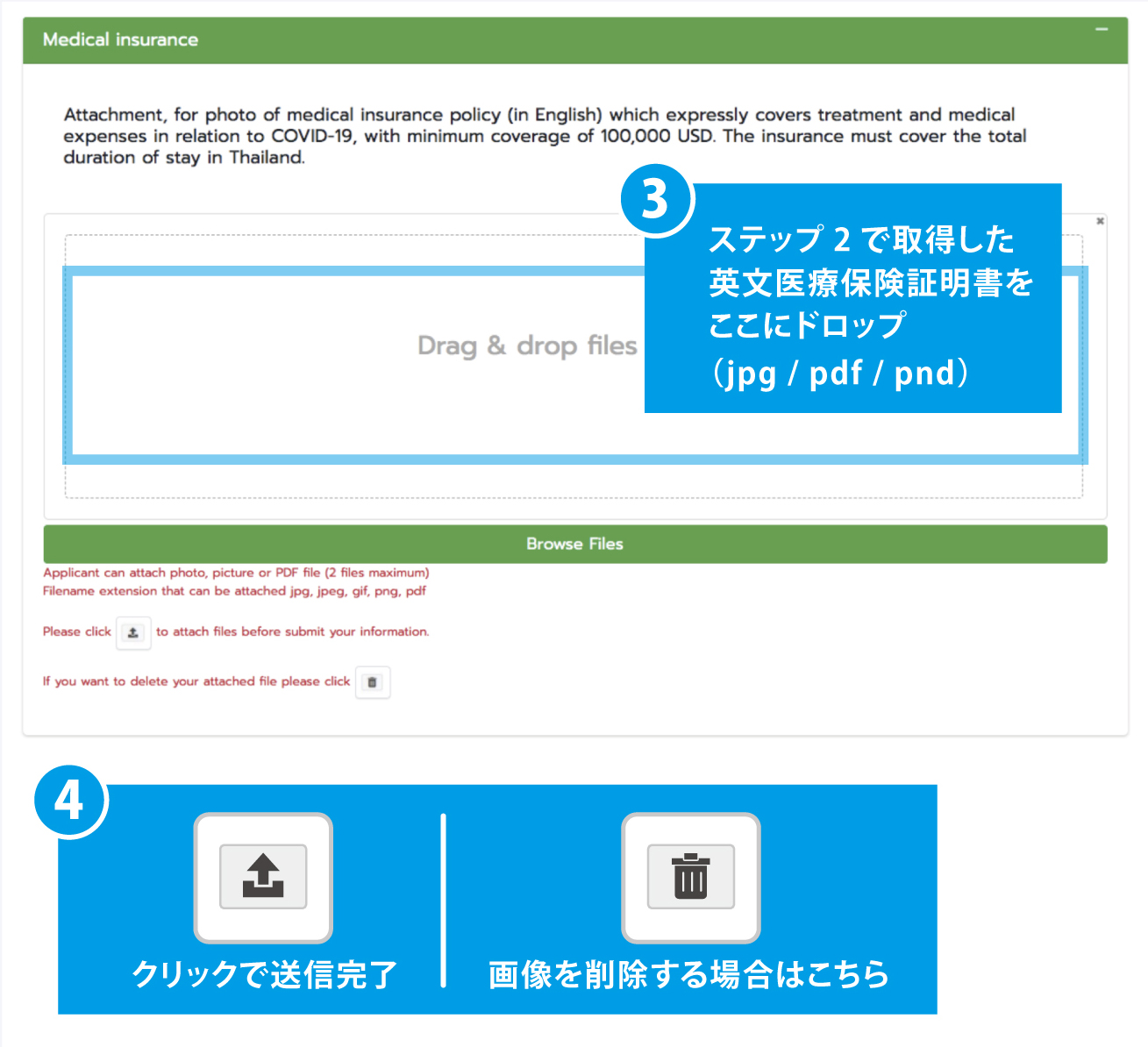 「Browse Files」をクリック(もしくはドラッグ・ドロップ)してセーブしておいた、保険証明書のデータファイルを選択する。