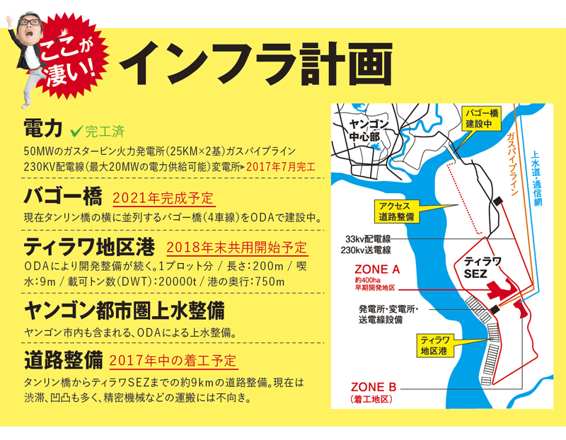 とはいえ、11年の民政移管後に普及した携帯電話は、17年中に100%に達すると見込まれ、ヤンゴン市内には高級ブランド店が入居するショッピングモールが並ぶ。日本食レストランも約20店舗に増え、“何もない”からの脱却が進んでいるのも事実。その原動力のひとつが、ティラワ経済特区に起因する。日本のODAで整備が進む、同国中核港湾のティラワ港に隣接する同国初の経済特区(SEZ)で総面積2400ha(東京ドーム500個分)を誇り、日本が官民を挙げてプロジェクトの推進に協力する同国の近代化へ向けた象徴的プロジェクトだ。
