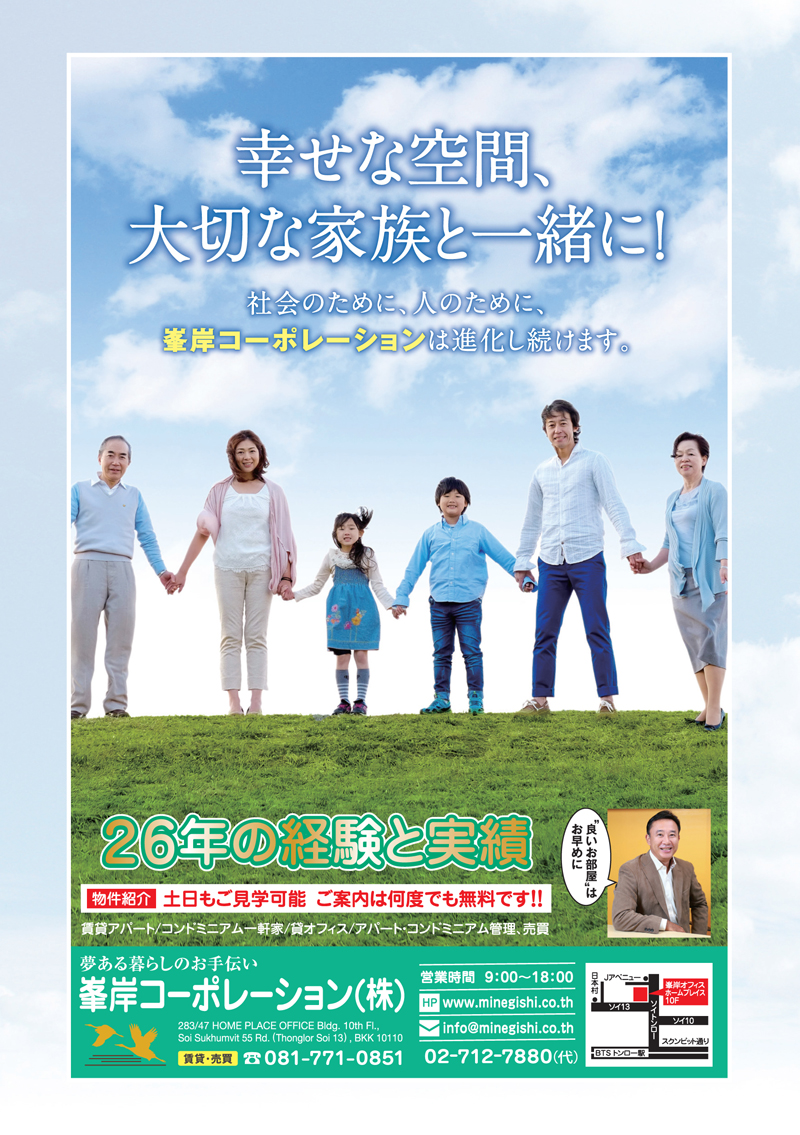 2018.04.17 その他 峯岸コーポレーション 峯岸コーポレーション HP : www.minegishi.co.th THAI SCOUT(タイスカウト)登録するだけでタイ転職の可能性が拡がる タイスカウトは、タイ(バンコクおよびその周辺)で働きたい日本人、日本語堪能なタイ人を対象にしたスカウト型転職サービスです。 「MITSUKOSHI DEPACHIKA」新年ギフトセット「GIFT FROM THE HEART」を発売 2026年の新春を彩る、日本スタイルのお歳暮・お年賀コレクション 「MITSUKOSHI DEPACHIKA」“心からの贈り物”という日本の贈る文化の精神を込めた新年… パンダバス 【残席わずか】蒸気機関車で行くチャチュンサオ・ピンクガネーシャ観光 この記事をSNSでシェア! Tweet Share LINE リンクをコピー