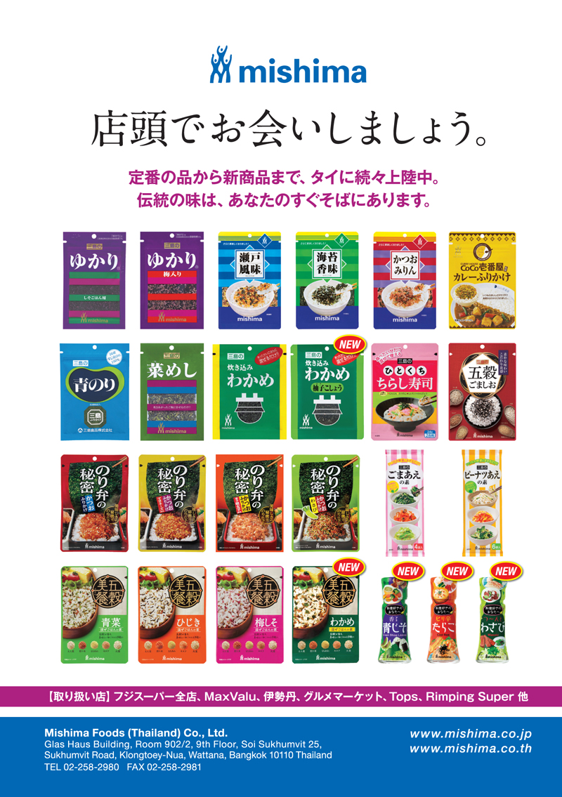 2018.04.17 その他 三島食品 三島食品 HP : www.mishima.co.th FB : Mishima Thailand 「MITSUKOSHI DEPACHIKA」新年ギフトセット「GIFT FROM THE HEART」を発売 2026年の新春を彩る、日本スタイルのお歳暮・お年賀コレクション 「MITSUKOSHI DEPACHIKA」“心からの贈り物”という日本の贈る文化の精神を込めた新年… 110Financial 帰国後、後悔しないために タイにいるうちにできることってなんだろう? 海外居住ステータスを活かした資産運用とは? 【Are you ready?】年末年始は海外?タイ国内? それとも日本? 2026年のスタート、あなたの特別なひと時をJTBが叶えます✨ 海外〜タイ国内まで、年末年始プランのご相談はお気軽にお問い合わせください。 この記事をSNSでシェア! Tweet Share LINE リンクをコピー