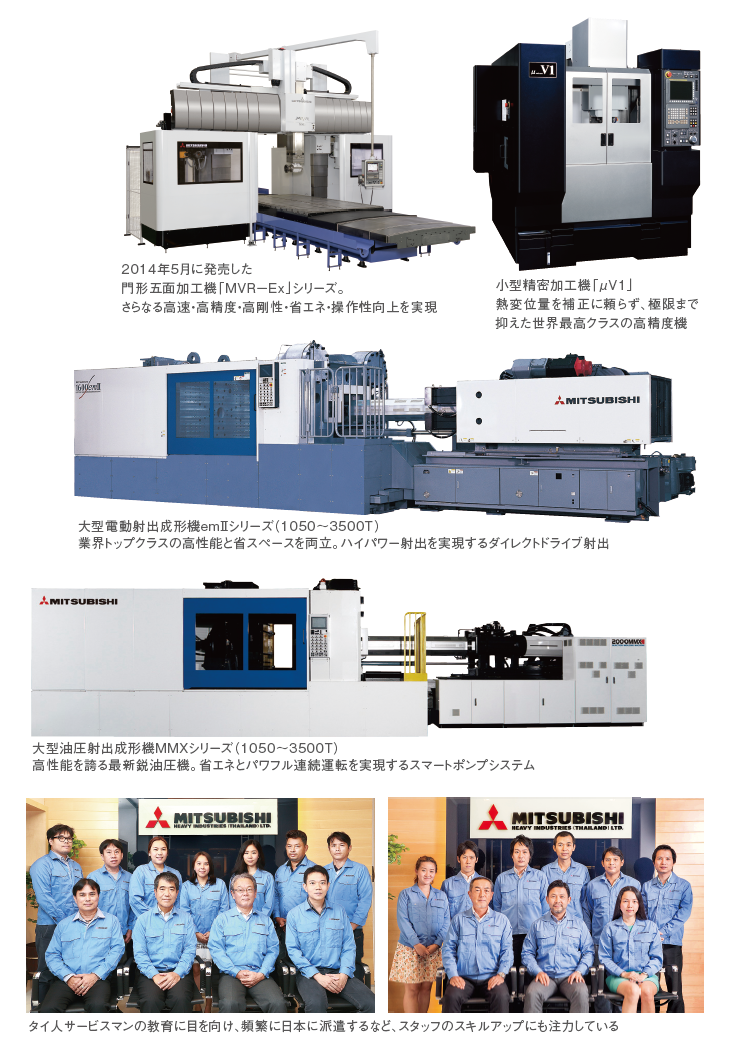 ジェット旅客機を製造するなど、世界の重工業界を牽引してきた三菱重工業。現地法人「泰国三菱重工業(MHIT)」は、1995年と設立は若いが、すでに80年代から日本人駐在員がバンコクに事務所を構え、“重工”の誇る最新の技術をタイの市場に伝えている。主に展開するのは、プラスチック加工には欠かせない射出成形機とミクロン単位の加工が求められる工作機械の販売及び保守サービス。現在、電動式に加え、油圧式大型射出成形機の新製品開発を行う日本メーカーはなく、油圧式の大型最新鋭機は同社のみ。電動式並の省エネ、かつ高性能機として高い評価を得ている。また、歯車工作機械は、粗加工から研磨工程まで取り揃え、タイで唯一自社メンテナンスを行うことが可能。大形工作機械は、門形・横形・特殊専用機と充実したラインナップ。射出成形機が約1000台、工作機械が約500台稼働している。それら現場に不可欠なのが、保守業務を受け持つサービススタッフの存在であり、人材育成にも注力。日本人サービスマンにとどまらず、タイ人スタッフも日本へ頻繁に派遣し、高度なトレーニングを積ませ、販売及び、現地サポートに至るまでの一貫したサービスの提供が可能となった。こうした現地サポートの充足度を求め、タイ進出を目指す新規顧客が取引先となったことも一度や二度ではなかった。主な取引先は自動車関連業界。一時的な市場の低調はあっても、ASEAN内最重要市場としての地位は不変。中でも車の軽量化ニーズもあり、今後も需要が続く。伝統的な〝威光〟にとどまらない人材とサービスの育成が、同社事業の根底を支えている。