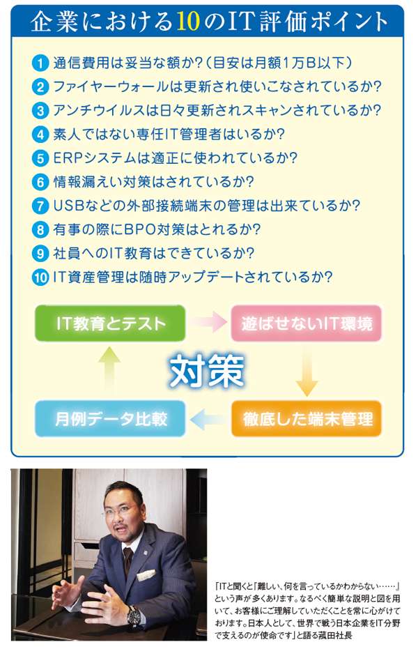 「10年以上この業界に携わっていますが、日系中堅企業のIT意識は成長していない。最近ではその弱点を突いて、外国企業が日本の技術を海外で盗む」と、ミューコムの菰田知宏社長は語る。同社はタイでITセキュリティを意識しながらIT機器の導入から保守までを手掛ける。「日本人もタイ人も関係ない。会社の資産であるPCで遊んではいけない。会社から転職サイトや賭博サイトに接続するのはもっての外。当たり前のモラルが管理できていない会社が多い」と警鐘を鳴らす。IT管理をどこまで詳しいかもわからないようなタイ人スタッフに丸投げしている事象も多いという。