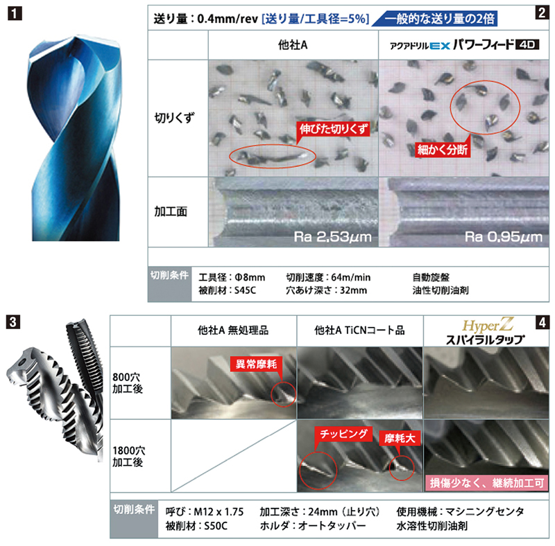 - ①自慢の新製品「アクアドリルEXパワーフィード」。切りくず分断性を向上し、切りくず排出性に劣るワーク回転での旋盤加工においても、抜群の排出性を実現
