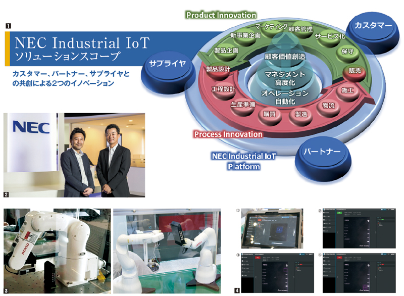 - ①2015年に販売開始した、製造業向けのIoTソリューション。カスタマー・パートナー・サプライヤ間を、プロダクトイノべ―ションとプロセスイノベーションの2本柱で支える