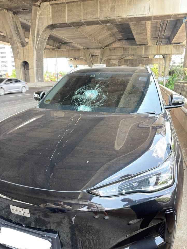 バンコク都バンナー〜トラート通り(上り線)において、走行中の乗用車のフロントガラスを金属製の物体が直撃する事故が発生。