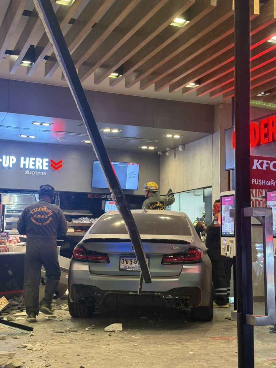 4月25日午後8時頃、バンコク都プラカノン区スクムビット通りソイ62にあるガソリンスタンド敷地内のKFC店舗に、高級車が正面のガラスを突き破って突入する事故が発生した。