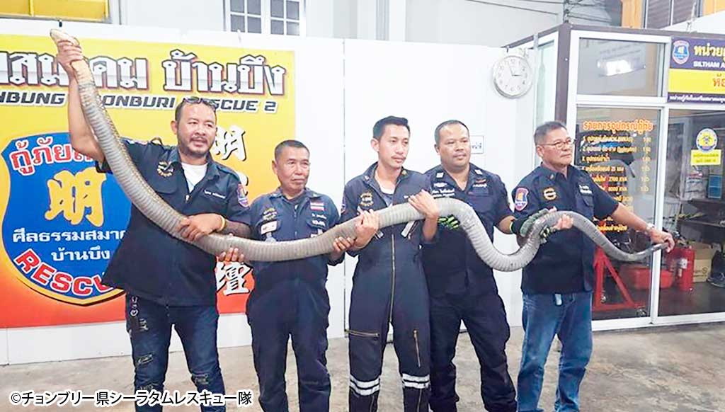2024.01.8 タイローカルニュース ゴルフ場に巨大な毒蛇全長4m以上のキングコブラ 東部チョンブリー県バンブン市のゴルフ場で1月2日、全長4mを超える毒蛇が発見されてレスキュー隊によって捕獲された。 レスキュー隊によると捕獲したのは体長4m20cmで、重さ12kgほどのキングコブラだったとのこと。 WISE公式LINEの友だち登録で、記事の続きをご覧になれます! 新規友達追加 既に友達登録済の方はこちら LINE友達追加ボタンで問題が発生する場合、こちらからご報告下さい。 WiSE公式LINEとは? WiSE公式LINEでは、毎日タイについての最新ニュースを配信。 タイ生活に欠かせない情報や、WiSE公式LINEフォロワー限定の、プレゼントキャンペーン等も実施しています。 この機会に是非ご登録ください。 今週のタイのニュース動画まとめ WiSE公式LINE登録後に動画が視聴可能となります。 今週のタイのニュース動画まとめ