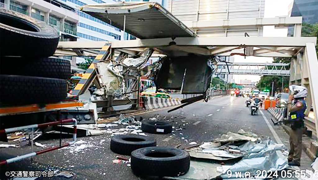 2024.05.20 タイローカルニュース パヤタイ交差点でトラック事故高さ制限標識に衝突 バンコク都シーアユタヤ通りのパヤタイ交差点近くで5月9日午前5時半頃、トラックが高さ制限の標識に衝突する事故が発生した。破損した部品が路上に散らばり、大渋滞を巻き起こしている。 調べによるとトラックがタイヤを輸送中に、コンテナボックスが地上から高さ3.1mにある制限標識にひっかかってボックス全体を破損させたという。 WISE公式LINEの友だち登録で、記事の続きをご覧になれます! 新規友達追加 既に友達登録済の方はこちら LINE友達追加ボタンで問題が発生する場合、こちらからご報告下さい。 WiSE公式LINEとは? WiSE公式LINEでは、毎日タイについての最新ニュースを配信。 タイ生活に欠かせない情報や、WiSE公式LINEフォロワー限定の、プレゼントキャンペーン等も実施しています。 この機会に是非ご登録ください。 今週のタイのニュース動画まとめ WiSE公式LINE登録後に動画が視聴可能となります。 今週のタイのニュース動画まとめ