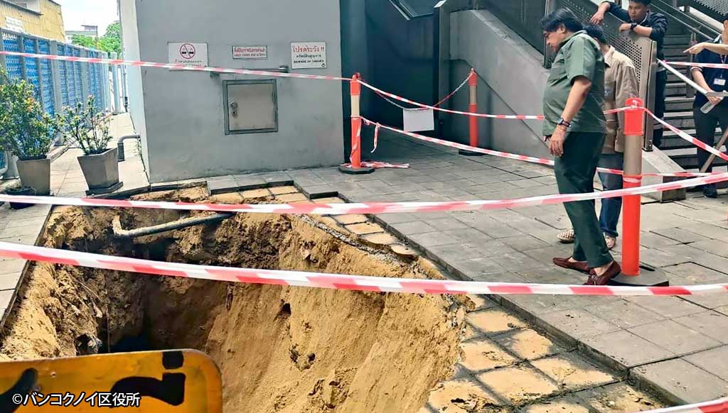 バンコク都バンコクノイ区MRTファイチャイ駅近くの歩道が8月25日に陥没し、深さ約2mの穴ができた。幸い死傷者はでていない。現場は同駅につながる階段すぐ横の歩道で、道路の安全性が問われている事態となっている。
