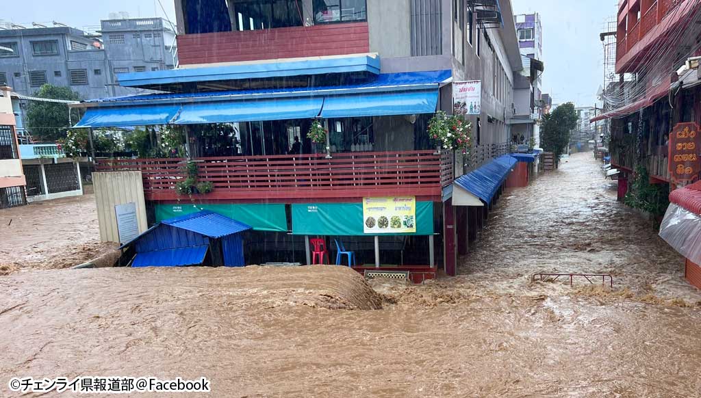 9月10日午後3時頃から、台風11号(ヤギ)の大雨による影響により北部チェンライ県のリゾート地メーサーイ市やメーチャン市などを中心としたエリアで大規模な洪水被害が確認されている。