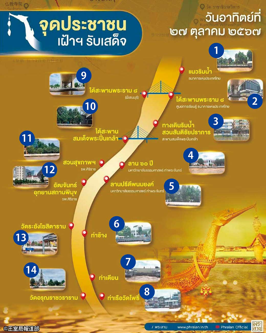 チャオプラヤー川沿いの14カ所で一般人も鑑賞が可能できるほか、混雑緩和のためLEDディスプレイを使った中継も予定されている。