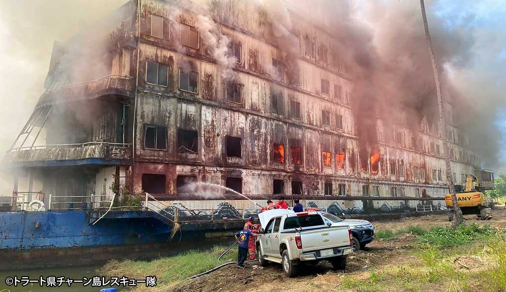 12月3日午後1時頃、東部トラート県チャーン島の廃リゾートホテル「Koh Chang Grand Lagoona」の敷地内にある観光スポット「幽霊客船」で大規模な火災が発生。消防隊によると、火は船尾から5階の最上階まで広がり、船の約50%が被害にあったという。