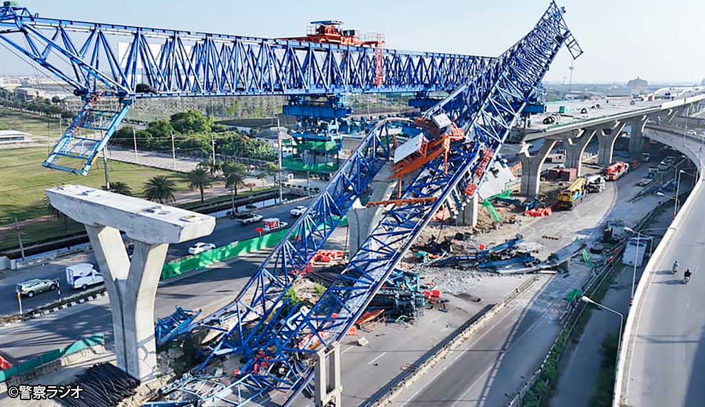 調べによると、建設作業員が工事現場で部品を溶接している最中に、一帯を支えていたガントリークレーンとコンクリートスラブが倒壊して作業員が下敷きになったという。スリヤ運輸大臣によると、建設は中断されて当局が倒壊の原因について調査中とのこと。また事故現場付近は約1kmの区間で道路が閉鎖され、再開には2週間を要するとみられている。(11月30日=タイラット)