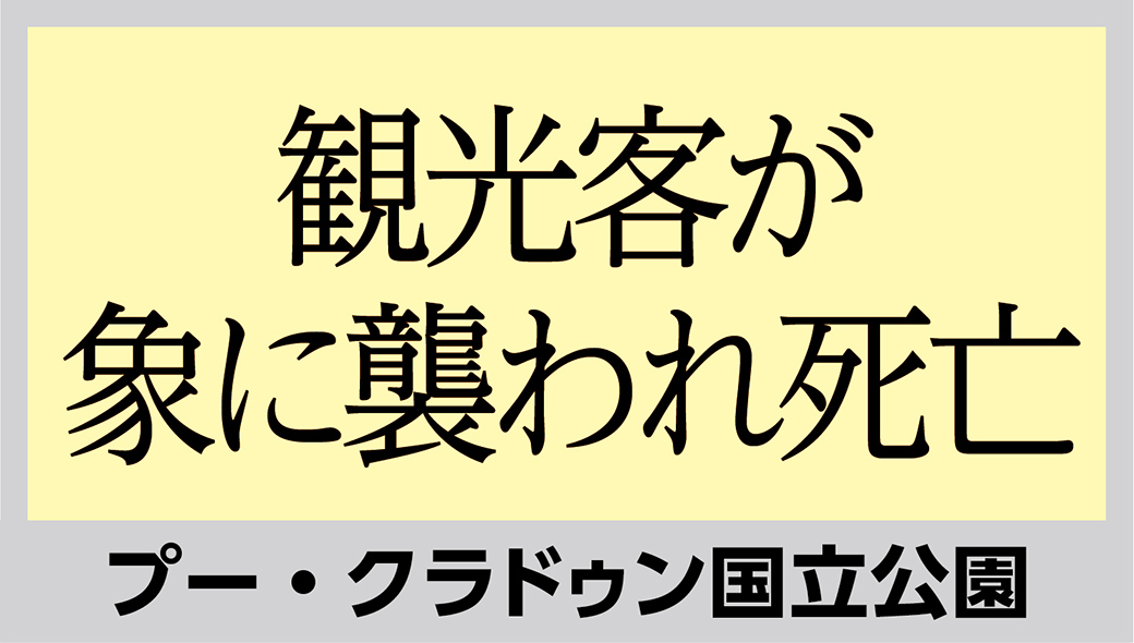 2024.12.23 タイローカルニュース プー・クラドゥン国立公園で観光客が象に襲われ死亡 東北部ルーイ県のプー・クラドゥン国立公園内で12月11日、タイ人女性観光客が野生の象に襲われて死亡する事故が起きた。 タイ国立公園・野生動物・植物保全局(DNP)によると、女性の遺体はペンポップ滝につながる道で発見されたという。 WISE公式LINEの友だち登録で、記事の続きをご覧になれます! 新規友達追加 既に友達登録済の方はこちら LINE友達追加ボタンで問題が発生する場合、こちらからご報告下さい。 WiSE公式LINEとは? WiSE公式LINEでは、毎日タイについての最新ニュースを配信。 タイ生活に欠かせない情報や、WiSE公式LINEフォロワー限定の、プレゼントキャンペーン等も実施しています。 この機会に是非ご登録ください。 今週のタイのニュース動画まとめ WiSE公式LINE登録後に動画が視聴可能となります。 今週のタイのニュース動画まとめ