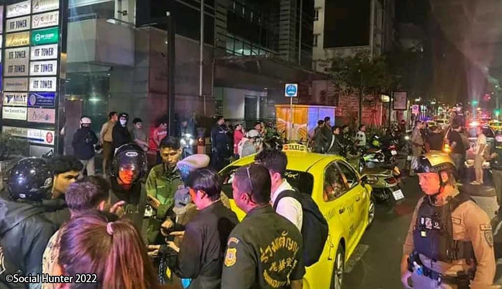 乗客によると、会社のパーティ後に男性3人と女性1人の計4人でシーロムからトンロー周辺へ行くためにタクシーを捕まえたが、乗車拒否されたため車のドアを閉めて他のタクシーを探そうとしたところ、力任せでドアが閉められたことに不満を持った運転手が乗客を呼び止めて口論に発展。口論の末に運転手が運転席からフルーツナイフを取り出して、男性の1人の顔に切りかかったとのこと。切り傷は10cmほどで、32針を縫う大怪我を負ったという。その後、運転手は騒ぎを聞いてかけつけた人たちに集団リンチされ、病院へ搬送されたという。