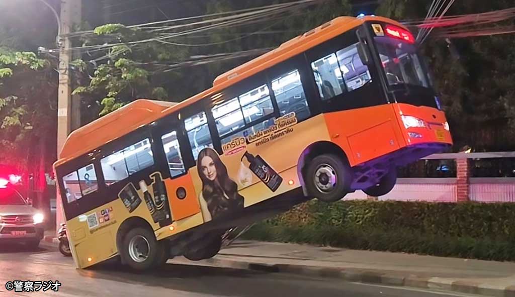 バンコク都トンブリー県マハサワイ交差点近くで2月11日午前0時半頃、路線バスが電柱のケーブルに引っかかり車体が持ち上がる事故が発生した。