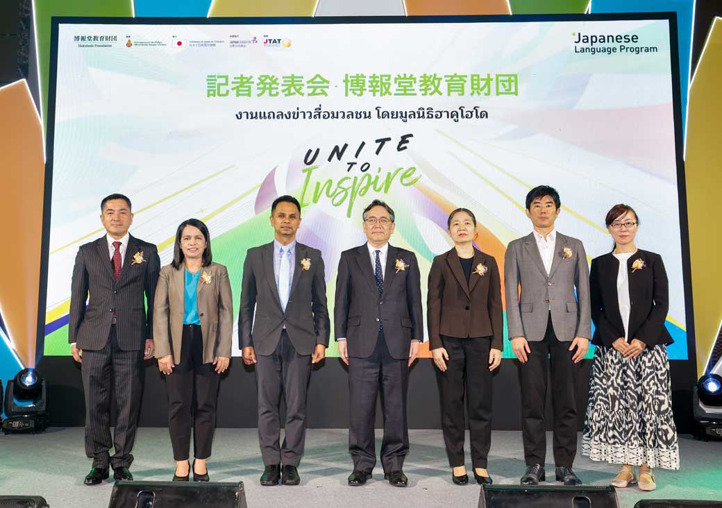 博報堂教育財団常務理事 中馬淳氏(真ん中)、タイ教育省基礎教育委員会事務局 (OBEC/Director of Bureau of Academic Affairs and Educational Standards, Acting Senior Advisor on Educational Standards)ウィサヌ・サッブソンバット博士(左から3番目)、タイ教育省基礎教育委員会事務局(OBEC/Director of Translation and Second Foreign Languages Promotion Institute)グンユアン・ヌッタキアン氏(左から2番目)、タイ国日本語日本文化教師協会会長 スニーラット・ニャンジャローンスック准教授(右から3番目)、在タイ日本国大使館 一等書記官 谷村 隆昌氏(右から2番目)、国際交流基金バンコク日本文化センター 日本語部部長 阿部 かおり氏(右)、並びに、HILL ASIA Co., Ltd. 伊藤曜久氏(左)の立ち会いのもと、「エデュテイメント教材制作プロジェクト」の記者発表会が開催されました。本プロジェクトは、タイの日本語教師が授業で活用できる教材を提供し、学生が自然でリアルな文脈の中で日本語を学べることを目的としています。興味のある方は、2025年3月3日以降、次のリンクから博報堂教育財団のエデュテイメント教材の視聴・学習ができます https://hakuhodo-jplang.org/jp/edutainment/ 。詳細のお問い合わせは https://hakuhodo-jplang.org/jp/about-us までお願いします。