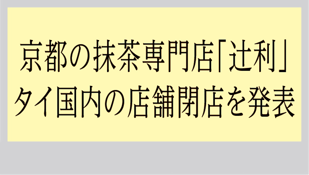 2025.03.17 タイローカルニュース 京都の抹茶専門店「辻利」タイ国内の店舗閉店を発表 日本・京都発の老舗抹茶専門店「辻利(TSUJIRI)」が、タイの公式SNSでタイ国内にある全店舗の閉店を発表した。最終営業日は3月31日とのこと。 同店はこれまでエムクオーティエ、サイアムパラゴン、アイコンサイアムなどの人気商業施設内に店舗を構えており、現在はセントラルワールド店のみで営業している。(3月10日=マティション) WISE公式LINEの友だち登録で、記事の続きをご覧になれます! 新規友達追加 既に友達登録済の方はこちら LINE友達追加ボタンで問題が発生する場合、こちらからご報告下さい。 WiSE公式LINEとは? WiSE公式LINEでは、毎日タイについての最新ニュースを配信。 タイ生活に欠かせない情報や、WiSE公式LINEフォロワー限定の、プレゼントキャンペーン等も実施しています。 この機会に是非ご登録ください。 今週のタイのニュース動画まとめ WiSE公式LINE登録後に動画が視聴可能となります。 今週のタイのニュース動画まとめ