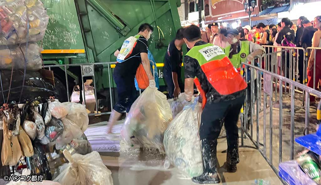 都庁によると、バンコク都最大のソンクラン会場となったプラナコン区では、4月13日〜15日の3日間で約150tのゴミが回収されたという。(4月16日=マティション)