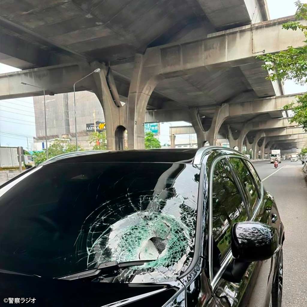 4月29日、バンコク都バンナー区バンナートラート通りでコンクリート破片が落下し、走行していた車のフロントガラスに直撃する事故が発生。当初は工事現場などから破片が落下したものとみられていたが、防犯カメラの映像からある男が故意に落としたものだと判明。