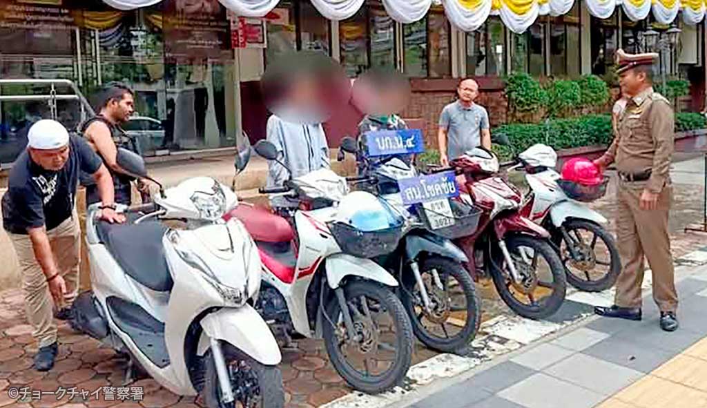 2025.05.26 タイローカルニュース 80台以上のバイクを盗む窃盗犯2人を逮捕 バンコク都フワイクワン区で5月19日、バイク窃盗犯の男2人が警察のおとり捜査で逮捕された。 取り調べによると、2人はラップラオ周辺を中心にバイクを盗み、西部カンチャナブリー県国境のブローカー業者に売りさばいていたという。2人は以前から同様の盗みを働いており、80台以上のバイクをブローカーに売っていたことが判明している。(5月19日=マティション) WISE公式LINEの友だち登録で、記事の続きをご覧になれます! 新規友達追加 既に友達登録済の方はこちら LINE友達追加ボタンで問題が発生する場合、こちらからご報告下さい。 WiSE公式LINEとは? WiSE公式LINEでは、毎日タイについての最新ニュースを配信。 タイ生活に欠かせない情報や、WiSE公式LINEフォロワー限定の、プレゼントキャンペーン等も実施しています。 この機会に是非ご登録ください。 今週のタイのニュース動画まとめ WiSE公式LINE登録後に動画が視聴可能となります。 今週のタイのニュース動画まとめ