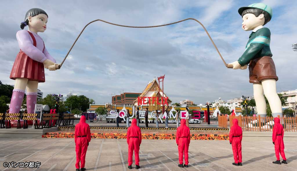 プラナコン区の都庁舎広場(ラーン・コンムアン)に6月28日〜7月6日の期間、Netflix発の人気韓国ドラマ「イカゲーム(Squid Game)」に登場する人形「ヨンヒ」と「チョルス」の巨大人形が設置される。