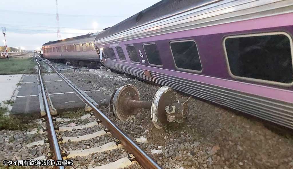 2025.08.18 タイローカルニュース 国鉄南部線脱線事故クイブリー駅で発生、7人負傷 8月9日早朝、タイ国有鉄道(SRT)南部線の列車が脱線し、7人が負傷した。 SRTの発表によると、列車はスンガイコーロックからクルンテープアピワット駅(バンスー中央駅)に向かっている最中にクイブリー駅近くの線路で3両の客車が脱線したという。負傷した7人は病院へ搬送され、同じ車両に乗っていた他の乗客らは代わりに手配された車に乗り目的地へ向かったという。 WISE公式LINEの友だち登録で、記事の続きをご覧になれます! 新規友達追加 既に友達登録済の方はこちら LINE友達追加ボタンで問題が発生する場合、こちらからご報告下さい。 WiSE公式LINEとは? WiSE公式LINEでは、毎日タイについての最新ニュースを配信。 タイ生活に欠かせない情報や、WiSE公式LINEフォロワー限定の、プレゼントキャンペーン等も実施しています。 この機会に是非ご登録ください。 今週のタイのニュース動画まとめ WiSE公式LINE登録後に動画が視聴可能となります。 今週のタイのニュース動画まとめ