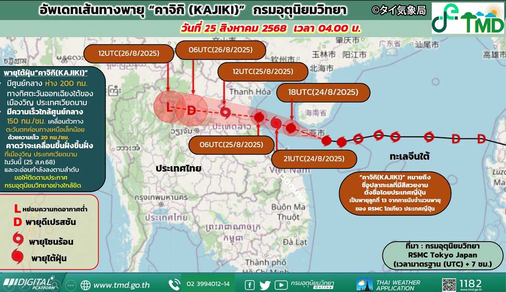 8月25日午前4時、タイ気象局が台風13号「カジキ」に関する最新情報を発表。台風13号の中心はベトナム・フエ市の東南方向に約200km離れた地点にあり、今日中にベトナム北部に上陸および熱帯低気圧に変わり、26日にラオスに移動し、26日の夕方にはタイのナーン県に移動すると予想。