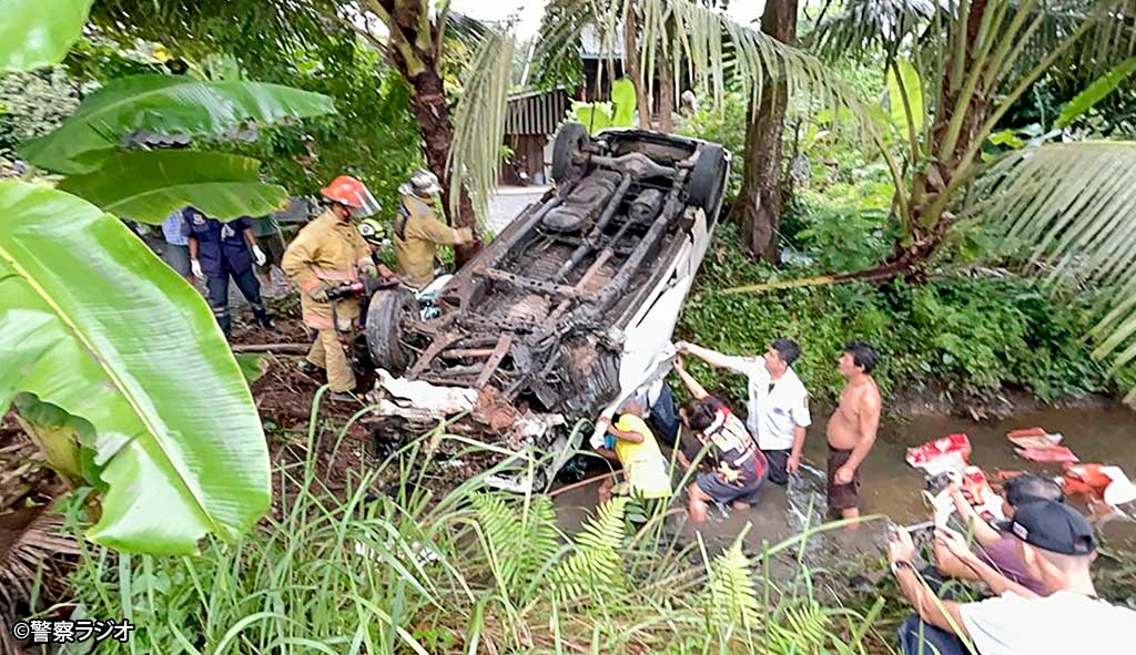 9月14日午前6時半頃、東部トラート県でピックアップトラックが脱輪し横転事故が発生。当局の調査によると、連日の雨で路面が泥に覆われ、曲がり角でスリップした際に制御を失い、脱輪に至ったという。運転手含むタイ人4人が重傷を負った。