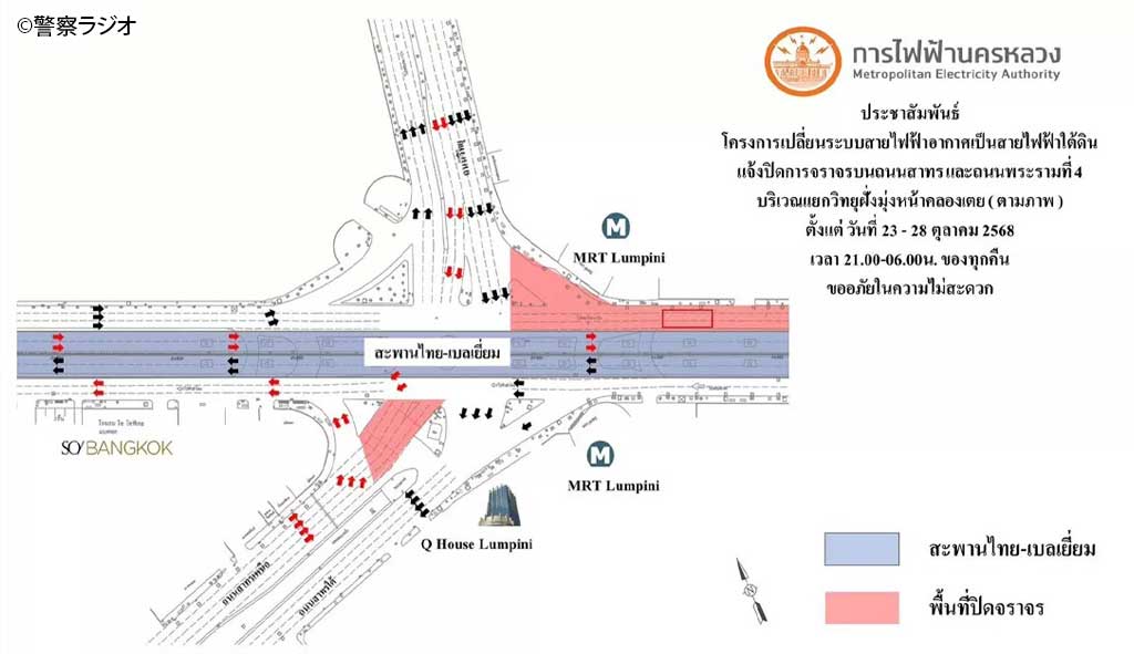 首都圏配電公社(MEA)は、バンコク都サトーン通りとラマ4世通り(ウィッタユ交差点)での電線地中化工事による夜間交通規制が実施されると発表した。10月23〜28日に毎日午後9時〜翌日午前6時まで交通規制が設けられる。(通行止めとなるのは画像の赤い部分)