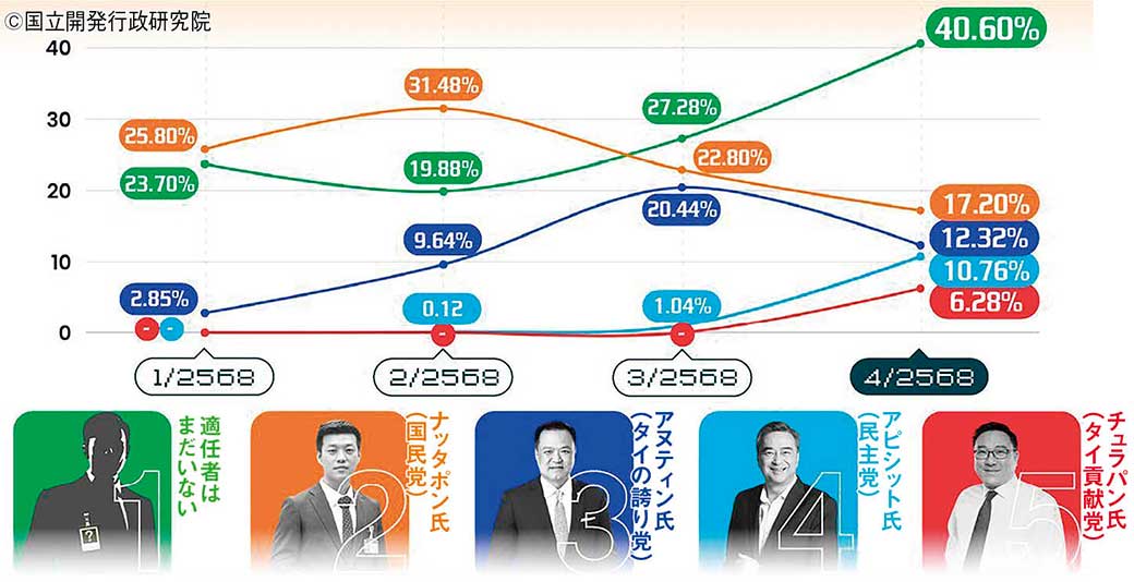「現状で誰が最も首相にふさわしいか」の質問に対して、40.60%(前回27.28%)が「適任者はまだいない」、17.20%(前回22.80%)が「ナッタポン氏(国民党)」、12.32%(前回20.44%)が「アヌティン氏(タイの誇り党)」、10.76%(前回1.04%)が「アピシット氏(民主党)」、6.28%(前回は候補にいなかった)が「チュラパン氏(タイ貢献党)」などと回答。