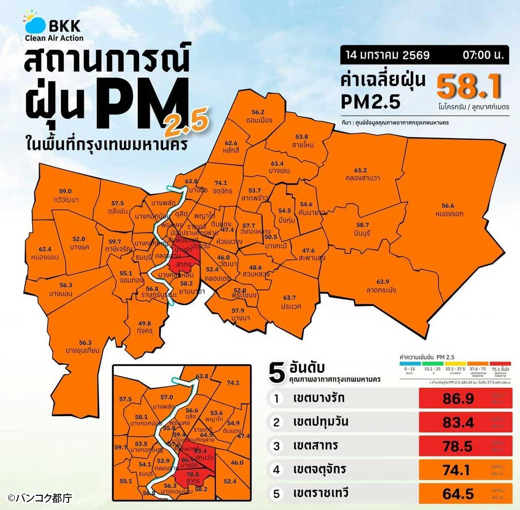 2026.01.14 タイローカルニュース PM2.5による大気汚染バンコク3区で75.1µg/㎥以上を確認 1月14日、タイ災害防止軽減局(DDPM)がバンコク都内3区に対して大気汚染に関する警報「セルブロードキャスト」を配信した。 同局が7:00に計測しているPM2.5大気汚染状況では、バンコク全域で「健康に影響しはじめる(37.6〜75 µg/㎥)」以上を確認。 WISE公式LINEの友だち登録で、記事の続きをご覧になれます! 新規友達追加 既に友達登録済の方はこちら LINE友達追加ボタンで問題が発生する場合、こちらからご報告下さい。 WiSE公式LINEとは? WiSE公式LINEでは、毎日タイについての最新ニュースを配信。 タイ生活に欠かせない情報や、WiSE公式LINEフォロワー限定の、プレゼントキャンペーン等も実施しています。 この機会に是非ご登録ください。 今週のタイのニュース動画まとめ WiSE公式LINE登録後に動画が視聴可能となります。 今週のタイのニュース動画まとめ
