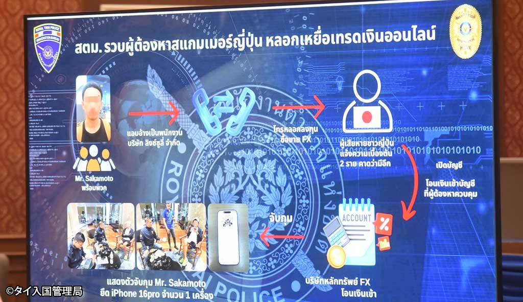 2026.01.19 タイローカルニュース トンローのコンドで日本人拘束FX投資詐欺で日本から逮捕状 1月8日、バンコク都トンローエリアのコンドミニアムで日本人の男(39歳)が摘発された。 入国管理局の発表によると、男は騒音トラブルを起こしていたことから捜査が行われ、2023年にオンラインFX投資詐欺へ関わっていたことが判明。日本からの逮捕状を受け、タイに国外逃亡していたという。 WISE公式LINEの友だち登録で、記事の続きをご覧になれます! 新規友達追加 既に友達登録済の方はこちら LINE友達追加ボタンで問題が発生する場合、こちらからご報告下さい。 WiSE公式LINEとは? WiSE公式LINEでは、毎日タイについての最新ニュースを配信。 タイ生活に欠かせない情報や、WiSE公式LINEフォロワー限定の、プレゼントキャンペーン等も実施しています。 この機会に是非ご登録ください。 今週のタイのニュース動画まとめ WiSE公式LINE登録後に動画が視聴可能となります。 今週のタイのニュース動画まとめ