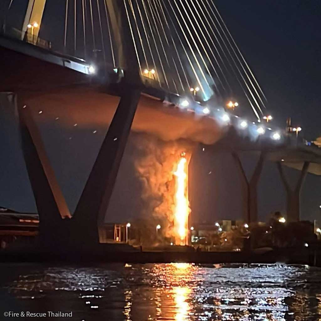1月15日午後8時頃、中部サムットプラーカーン県にあるプミポン橋(2号)の橋下で火災が発生。橋下に設置されていた全長50m以上の配管は全焼したが、橋自体への被害および死傷者はなかった模様。