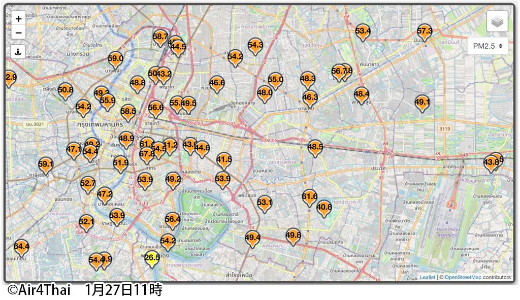 バンコク都環境事務局大気汚染対策センターが、1月27日午前7時に測定したPM2.5大気汚染の状況を発表。バンコク都全50区で「健康に影響しはじめる(37.6〜75 µg/㎥)」大気汚染が確認されている。