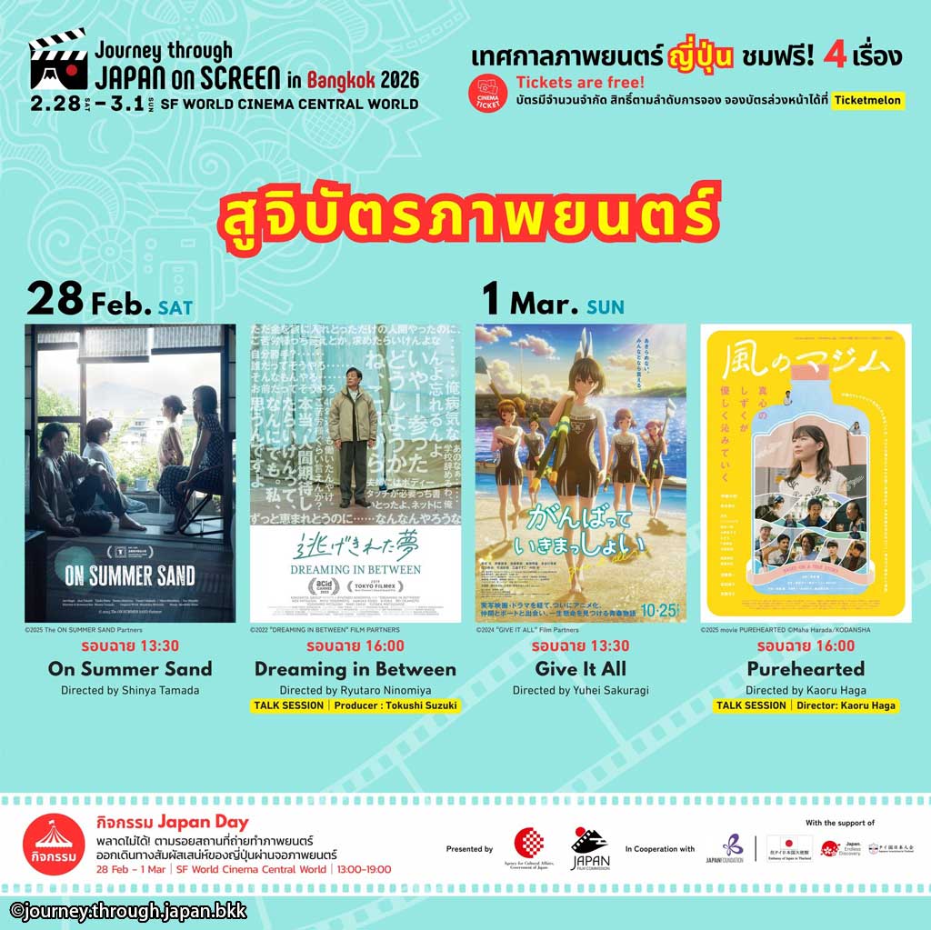2月28日(土)、3月1日(日)にセントラルワールド内の映画館SF World Cinemaで、日本映画祭「Journey through Japan on Screen in Bangkok 2026」が開催される。
