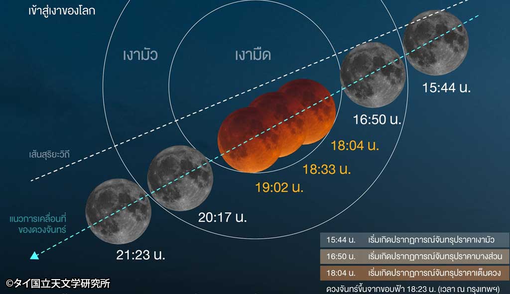 タイ国立天文学研究所(NARIT)は3月3日に皆既月食が観測できると告知した。発生時間はタイ時間の15時44分〜21時23分で、タイにおいては仏教祭日「マカブーチャ(万仏節)」と同じ日であることから注目を集めている