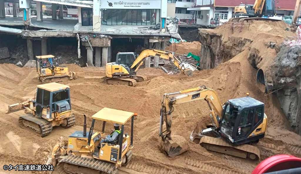 2025年9月24日に発生したバンコク都ワチラ病院前のサムセーン通り(MRTパープルラインの建設現場)での大規模な陥没事故。タイ高速鉄道公社(MRTA)は2月27日に修復の進捗および今後の対応について明らかにした。