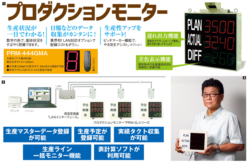 - ①日報などのデータ収集が簡単に行える「プロダクションモニター」。サイズは小型〜中型、表示も3〜4段など様々なタイプを用意。緑、黄、赤色で作業の進捗状況がわかり、即時対応が可能となった。導入した企業からは「作業効率が大幅に向上した」という評価を得ている