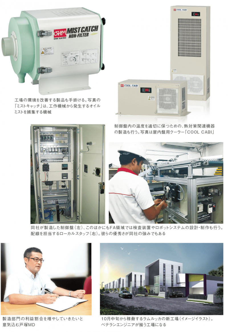 オーム電機の事業領域は多岐にわたる。1959年に浜松市上池川町で創業した同社は、当初、配線パーツの開発からスタート。その後も生産現場に欠かせない機器を次々と世に送り出した。現在は計測・検査機器、熱対策器、環境機器製造のほか、FAラインの設計から製造まで、時代のニーズに合った製品を多種提供する企業へと成長を遂げた。同社の技術と多彩な製品群を世界に広めるため、初の海外拠点として作られたのが、オーム電機(タイランド)。1995年の設立以後、自動車メーカーや自動車部品メーカーを主な顧客として成長を続けてきた。今年は20周年を迎え、ラムルッカに新工場の建設も決定。ASEAN諸国への事業拡大を見据えた経営に舵を切った。「新工場は建坪1000㎡。日本人1名が常駐し、ローカルスタッフと合わせて、総勢20名で運営します」と、戸塚貴博マネージングダイレクター(以下MD)は説明した。同社の強みの一つは、経験のあるローカルスタッフを多数揃えていることだ。エンジニアは計13名体制で、メカニック設計・電子設計などのセクションに分かれている。そのほとんどが、10年以上のベテランだという。設計から製造に至るすべてのセクションで、高い技術を蓄積したスタッフが揃ったことで、現在は顧客それぞれに応じたFAを提案する業務にも積極的に足を踏み入れている。「タイは地理的にアジアのハブといえる場所。地の利を生かして現地調達の割合を高め、インドネシアなどASEAN諸国へのFA展開にも積極的に取り組みたいです」と戸塚MDはタイ法人の重要性を説いた。