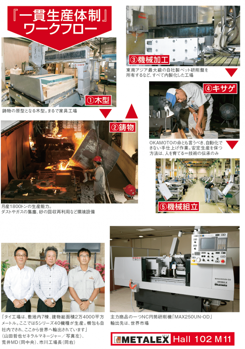 1926年(大正15年)創業の岡本工作機械製作所は、平面研削盤や歯車研削盤を他社に先駆け、国産開発に成功するなど、日本の研削盤メーカーのパイオニアだ。現在は、用途に応じた平面、成形、内面、円筒、歯車といった豊富な研削盤ラインナップで、他の追随を許さず、世界で唯一の総合砥粒加工機メーカーとして名を馳せる。世界へ輸出するなか、同社は生産・販売計画に応じて日本、シンガポール、タイの主要生産拠点を効率的にネットワーク化し、機種による生産分業体制を確立。また、タイ現地法人の荒井忠雄マネージングダイレクター(以下MD)が「分業体制は、生産効率だけでなく、技術の伝承の系譜でもあるんです。特に技能の象徴でもある手仕上げの“キサゲ作業”は、日本からシンガポールへ、そしてタイへと伝わっています」と語る通り、87年のタイ進出以降、多くのベテラン“キサゲ士”を育ててきた。一方、タイの地では、業界を牽引するリーディングカンパニーとしての責任を体現。他のメーカーでは類のない素材からの一貫生産体制を構築している。機械本体のベースとなる鋳物は木型の設計から製造までを社内で完結。部品加工、塗装、製品の組立完成に至るまで、徹底した内製化を進めた。「木型と鋳物工場が同じ敷地内にあること自体も珍しいんです」(市川明工場長)。一貫体制により、タイ工場では工作機械の増産(月産約90台)、納期短縮、トラブル発生時の早期解決、他メーカーの素材(鋳物)を請け負うなど、月産1800トン(鋳物)の生産能力を保有する。“一貫体制”だからこその強さなのだろう。