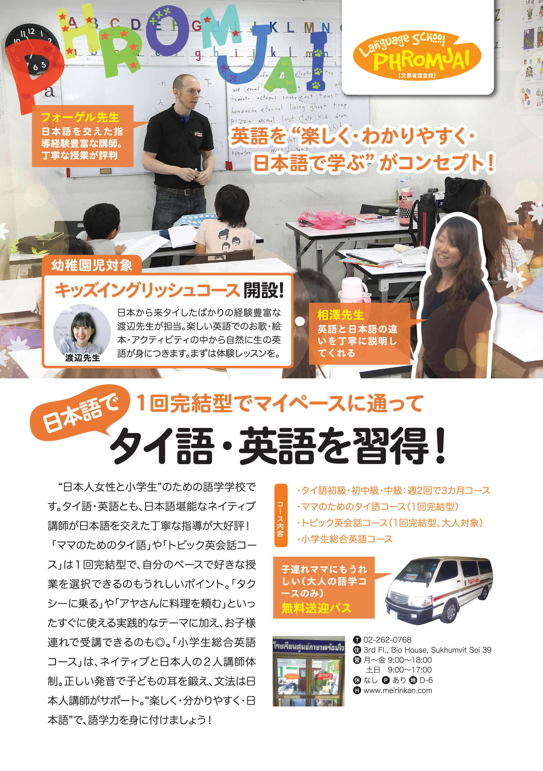 2018.04.17 その他 プロムジャイ・ランゲージスクール プロムジャイ・ランゲージスクール HP : www.meirinkan.com 「MITSUKOSHI DEPACHIKA」新年ギフトセット「GIFT FROM THE HEART」を発売 2026年の新春を彩る、日本スタイルのお歳暮・お年賀コレクション 「MITSUKOSHI DEPACHIKA」“心からの贈り物”という日本の贈る文化の精神を込めた新年… 「CloudRoom」でバンコク生活の収納問題解決へ スマホで収納!スマホで取り出し!ライフステージの変化などによって日に日に増えていく生活の身の回り品。… DYMクリニック 2024-2025年用インフルエンザワクチンの取り扱い開始 タイでは1年を通してインフルエンザに感染する可能性があるため、ワクチンの接種が推奨されている。DYM… JPグリーンデンタルクリニック × WiSE 特別対談 「日本人のための総合歯科」として在タイ日本人が通うJPグリーンデンタルクリニック。今回は同院の院長で… この記事をSNSでシェア! Tweet Share LINE リンクをコピー