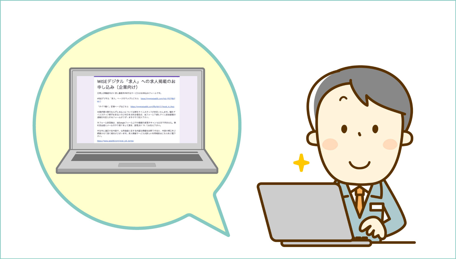 求人掲載申込みGOOGLEフォーム(企業向け)にて、必要事項をご記入・お申込みください。
