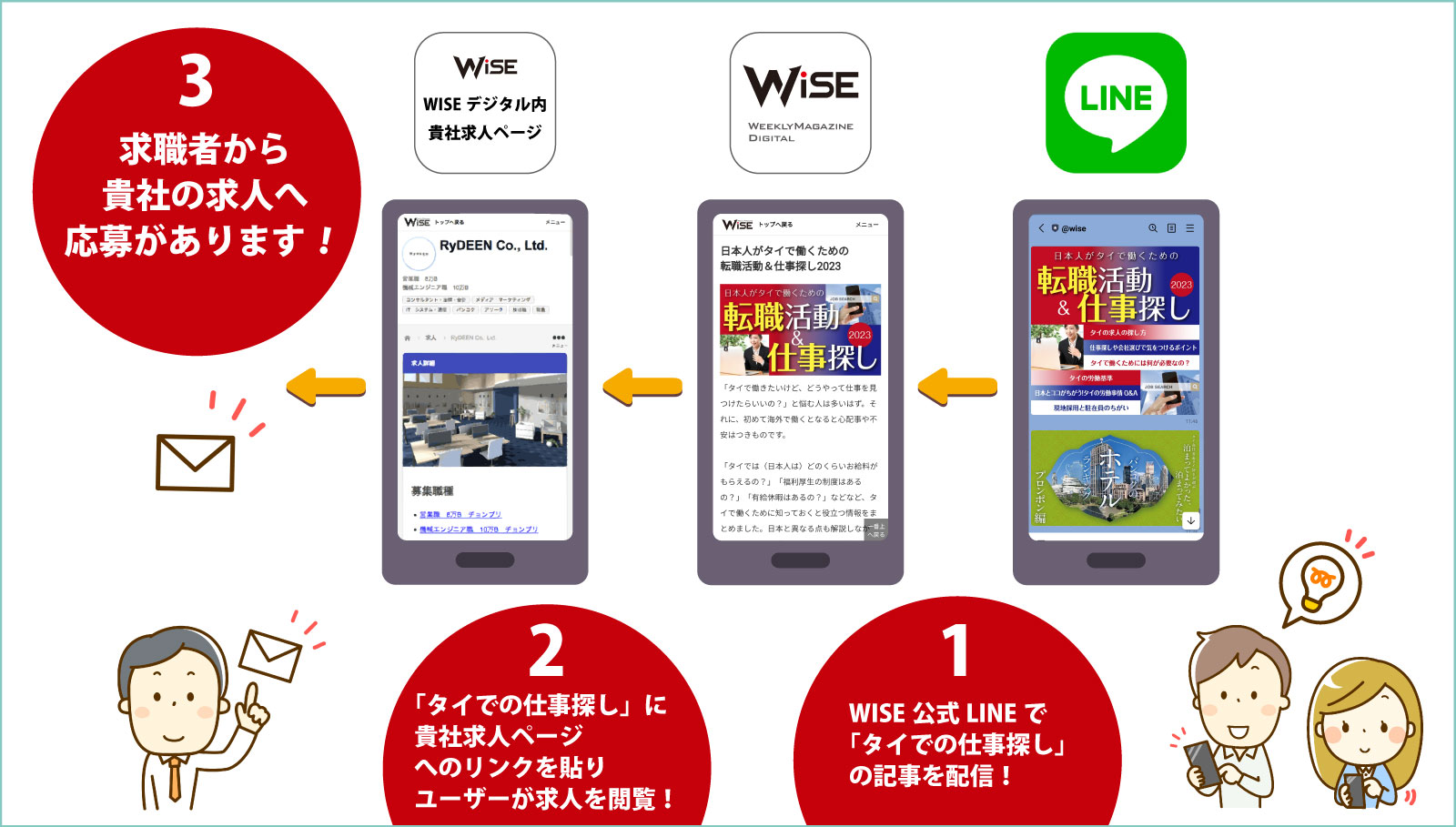 そこへはWiSE公式LINEなどで「タイでの仕事探し」の記事を定期的に配信して、「タイ在住ユーザー」または「タイに興味のあるユーザー」が貴社の求人ページへ訪問しやすいように誘導していきます。