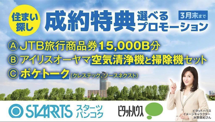 60,000B以上の物件を2021年3月末までに成約すると、3つの中から豪華な特典を選べます。